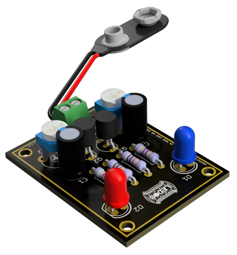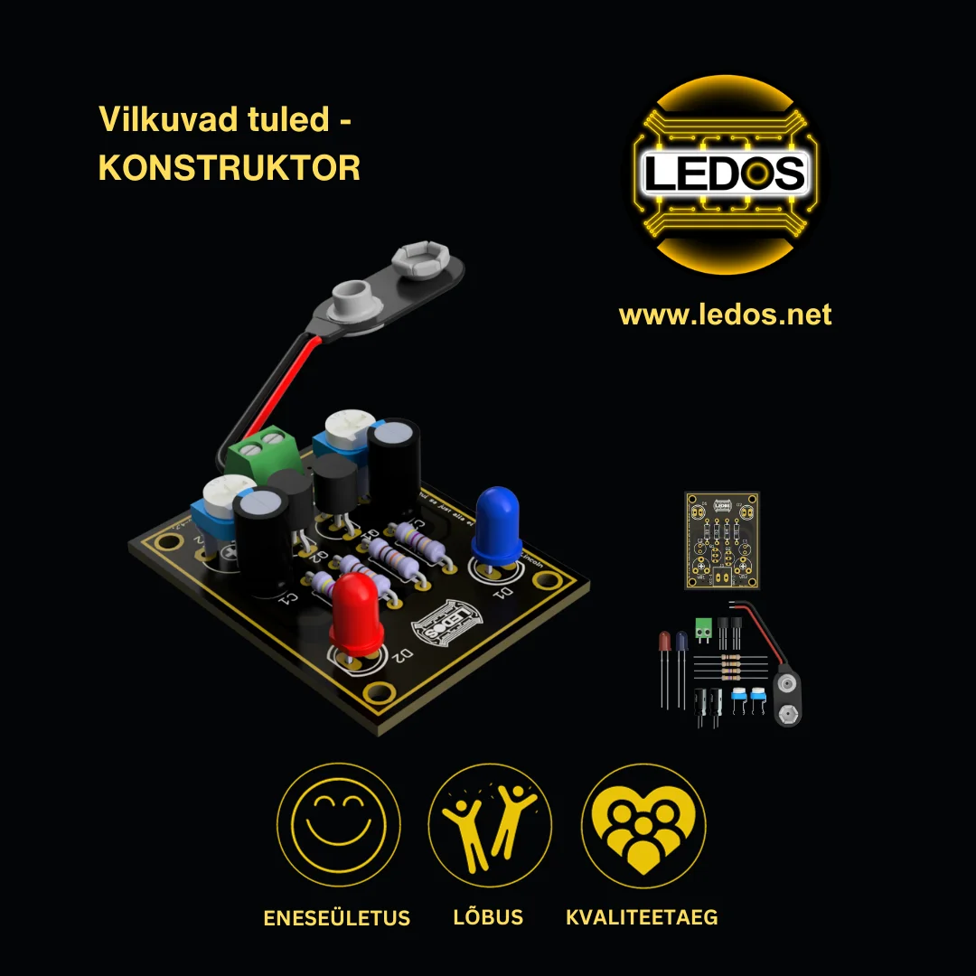 Vilkuvate tulede konstruktor töötab kahe transistori vahelduva lülitumise põhimõttel. Transistorid juhivad LED-i nii, et see süttib ja kustub perioodiliselt, tekitades vilkumise efekti.